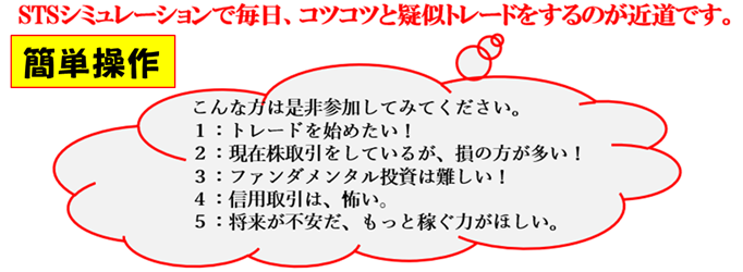 現物取引の経験はあるが、これから信用取引をしようと思うが、疑似体験で技術を磨きたい。株式のセミナーを受けて知識はあるが実際の経験が少ないため利益が出せない方。